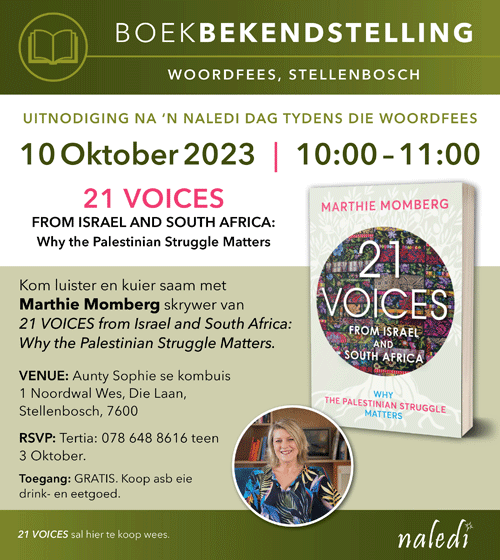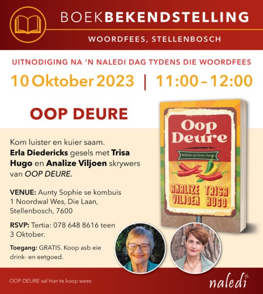 Dan is daar ’n volgende geleentheid op 10 Oktober by Aunty Sophie se Kombuis, Noordwal Wes 1, Die Laan, Stellenbosch, waar ek en ’n paar ander Naledi-skrywers elk op die uur van 10:00 tot 13:00 ons boeke aanbied en bespreek. My gesprek vind om 12:00 plaas met Jonathan Amid as aanbieder, en ek self tree op as aanbieder vir Lelanie Roode se gesprek om 13:00, waartydens ons haar boek, Olifant op ’n sweefstok, bespreek. Hierdie geleentheid is gratis en almal wat dit bywoon kan terselfdertyd tee, koffie en ligte eetgoed op eie koste bestel en geniet.