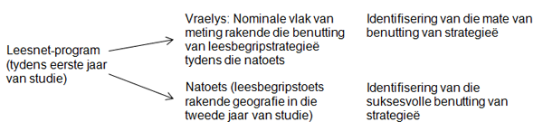 Die Leesnet-program moet ook binne die teoretiese raamwerk van die ontwikkeling van leesbegripstrategieë ondersoek word. Die ontwikkeling en implementering van Leesnet sluit volkome aan by die voorheengenoemde visie van die Witskrif vir Naskoolse Onderwys en Opleiding (South Africa, Department of Higher Education and Training 2013:xiv). Ten einde verder gehoor te gee aan die Witskrif moes die volgende vrae gevra word: (a) Tot watter mate pas studente leesbegripstrategieë wat in Leesnet onderrig word op ander vakgebiede toe? en (b) Tot watter mate dra dit by tot effektiewe leer en vordering op akademiese gebied?