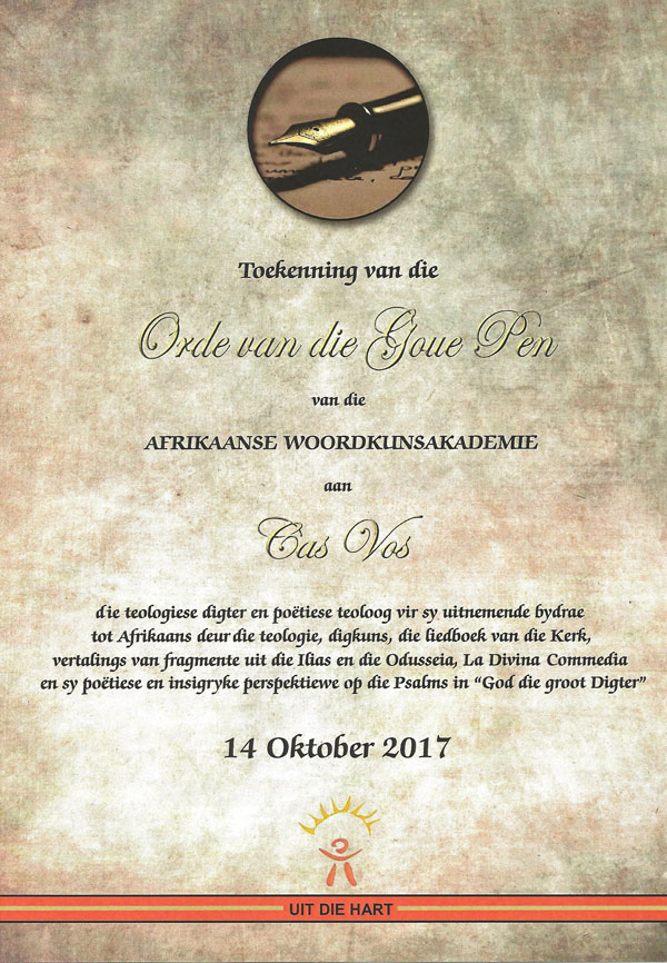Die Orde van die Goue Pen aan Cas Vos toegeken