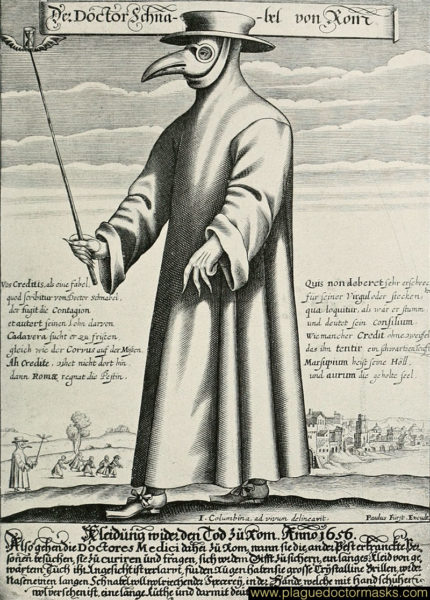 Maar wat was die bedoeling met hierdie twee syskriffies? Waarom sou die prosa-onderskrif nie genoegsame verduideliking van hierdie 17de-eeuse "PPE"-drag (personal protective equipment) wees nie? Klaarblyklik is fopnuus nie net ’n 21ste-eeuse verskynsel nie. Mense het blykbaar destyds geskrik vir die "voëlgesig" met sy "kristalglas"-bril (so beskryf die Duitse onderskrif dit) en die eienaardige, lang, wasgesmeerde kleed en handskoene. Gou ontstaan daar ’n verklaring: Die dood is tydens die Pes alomteenwoordig; die vreemde "voël" word telkens gewaar, op pad na waar mense die siekste is, soos wat die dokter die sterwendes besoek. Dus: "Dié vreemde gedaante wil lyke opvreet!" Hierdie dokter is nou op pad Rome toe, waar die Pes op sy ergste is.
