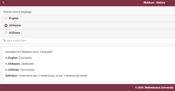 In MobiLex word vertalings in Afrikaans, Engels en Xhosa verskaf en die gebruiker kan dus suksesvolle soektogte na vertalings uitvoer soos die behoefte aan vertalings ontstaan. Met die gebruik van MobiLex in ’n verskeidenheid tale kan dit studente help met die leer van (nuwe) konsepte wat hul konseptuele begrip van die inhoud en konteks van die inligting kan verbeter, asook kennis van die addisionele taal bevorder.