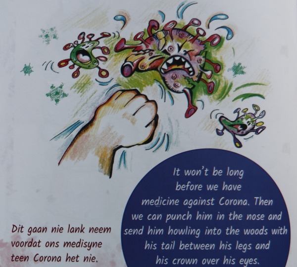 Die boek verduidelik ook dat Corona van vlermuise na mense gemuteer het en dat dit anders is as die gewone virusse waarmee ons vertroud is. Die belang van inentings word ook aangeraak.