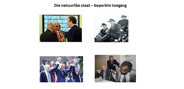 Hier belig die NWW-lens ‘n interessante, belangrike en positiewe kenmerk van ons huidige politieke ekonomie – in ‘n samelewing van beperkte toegang – ‘n lens wat fokus op die gebrek aan potensiële interne konflik. Alhoewel ons misdaad het, sg diensleweringsproteste, en ‘n polisiemag het wat soms min toegang het tot sekere gemeenskappe in die land, het ons nie militarisiese of burgermagte wat hulself aanspreeklik sien vir elite-groepe eerder as vir die staat nie. Dit beteken dat die soeke na nuwe en beter skikkings tussen ons elite-groepe ‘n beter kans het om stabiliteit te bewerkstellig – “jaw jaw” eerder as “war war” – en wat ons moontlik ook op ‘n ontwikkelingspad kan plaas wat tot almal se voordeel sal strek, op pad na ‘n samelewing van oop toegang.
