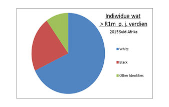 Ek sal my reaksie illustreer deur die gebruik van 'n onlangse skatting van individue wat meer as R1 miljoen per jaar verdien. Alhoewel beperk as 'n indikator, dui dit nietemin op 'n antwoord: Daar is volgens die Buro vir Marknavorsing 'n bietjie minder as 200 000 sulke persone. 68% is wit – wat dui op ‘n voortgesette meerderheid van wittes – sowat 22% is swart – wat dui op 'n stygende deel van welgestelde swart persone, al bly dit nog steeds 'n minderheid – en die res (10%) Suid-Afrikaners wat hulself geklassifiseer het as lede van ander bevolkingsgroepe.
