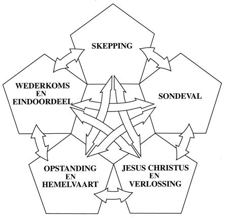 The five episodes of the grand narrative form a close unit which allows no further development but only refinement. A diagram made up of five pentagrams is developed to represent the five episodes and to show the extent of their interrelation. Take the second episode (Original Sin) as an example. This episode follows directly after Creation (first episode) and gives birth to the third episode (Crucifixion and Redemption). Without the Fall there would have been no need for the Son of God to become a human being and die on a Roman cross. His death on the cross is seen as a sacrifice to appease the wrath of God. The third episode is followed by the fourth (Resurrection and Ascension), representing the apex of the grand narrative. Jesus’ resurrection and ascension annulled the effects of the Fall. Death is conquered and humans are reconciled with God. They can once again live forever, as God envisaged during creation. The resurrection is regarded as the “first fruits” of the new creation. But before the new creation can be fully established there will be a Second Coming and a Judgement day (episode 5).
