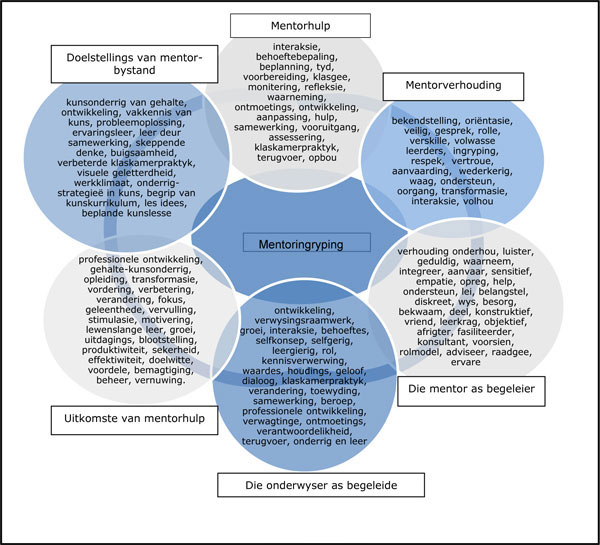 Die data wat by die vier skole ingesamel is, is ingedeel en ontleed volgens temas wat ontwikkel is uit die literatuur oor mentorhulp in onderwys asook literatuur oor gehalte- kunsonderrig. Die hooftemas wat na vore gekom het, is die verhouding tussen mentor en onderwyser, die rol van die mentor, die rol van die onderwyser, die doel van die mentorhulp, die mentorproses, en die uitkomste van die mentorhulp.