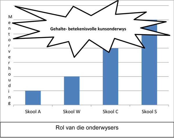 Die rol van die onderwyser by skool S is regdeur die projek die naaste aan die ideaal, voorgestel in figuur 2. Sonder om ’n ondergeskikte rol te speel, is sy leergierig en selfgerig en volg sy as begeleide die leiding van die mentor tot op die punt waar sy selfstandig en met selfvertroue lesse beplan en aanbied. Sy lewer insette en lê riglyne neer vir die vordering van die projek, wat haar eie professionele ontwikkeling – veral ten opsigte van haar vakkennis van kunsonderrig, maar ook die kunswerk van die kinders – bevorder.