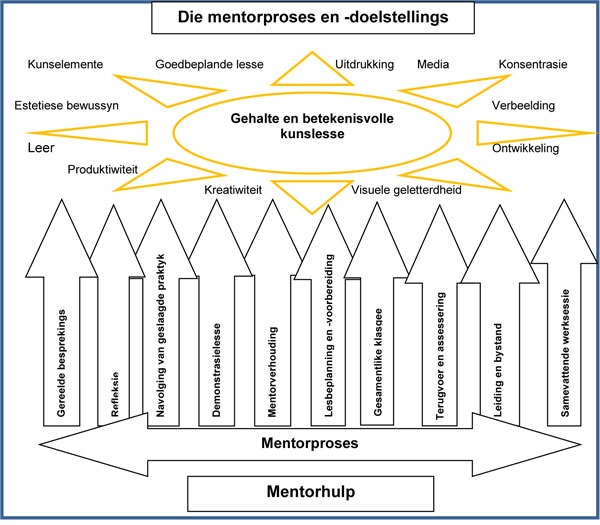 Die mentorhulp is op gehalte-kunsonderrig gerig. Die sikliese mentorproses begin met die daarstel van ’n verhouding tussen mentor en onderwyser. Albei speel ’n belangrike rol in die proses. Sodra die verhouding gevestig is, volg ’n behoefteontleding ten opsigte van die kunsonderrig van die onderwyser. Die mentoringryping word rondom die behoeftes van die onderwyser beplan. Die proses behels die gesamentlike beplanning van lesse, demonstrasielesse deur die mentor met die onderwyser as waarnemer, gesamentlike aanbiedings, lesbesprekings, afrigsessies en refleksie, waarna die siklus weer van voor af begin. Die proses eindig in praktiese werksessies. Regdeur die proses is daar boekgehou van alle gebeure, verslag gedoen en aan die einde is die projek deur albei partye geëvalueer.