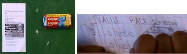 Soos in afdeling 6.1.2 uiteengesit, was die onderwyser ’n nuweling wat tydens die eerste onderhoud duidelik laat blyk het dat sy hulp soek met lesidees en leiding met die kunskurrikulum. Die resultate van haar eerste les, wat aangebied is as deel van die behoeftebepaling, word in foto A1 en foto A2 uitgebeeld. Tydens die les is ’n voorbeeld van ’n tandepastaverpakking teen die bord opgeplak en die kinders moes dit nateken.