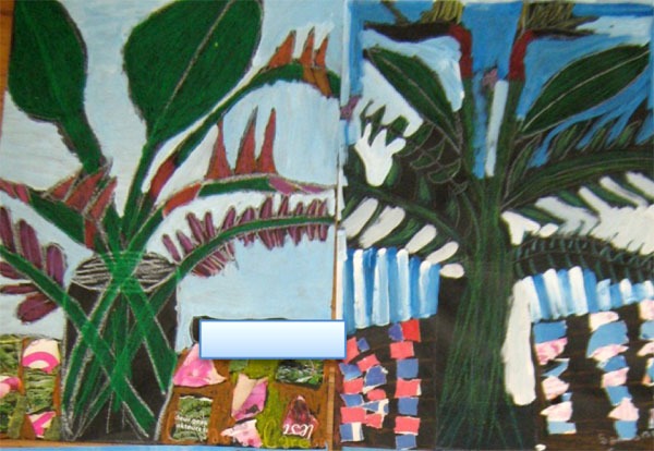 Die skeppende ervaring was vir die meeste van die kinders iets heeltemal nuut en die stilte en konsentrasie wat geheers het ten spyte van die beknopte werkruimte opvallend. Dit was opmerklik hoe hulle elke week voor die lokaal gewag het vir die mentor om op te daag met die kratte media – party het al by die parkeerterrein gewag om te help dra. Na die teken- en beplanningsgedeelte van die les het hulle met beperkte kleure poeierverf gewerk, ook vir die meeste kinders ’n eerste kennismaking. Die proses moes oor en oor verduidelik word, maar uiteindelik is die agtergrond van die prente geverf. Daar is ook collage met gekleurde tydskrifpapier op die tafeldoek onder die blompot gebruik en skeur-en-plak in ’n beperkte kleurskema was nog een van die prosesse wat die mentor en onderwyser aan hulle moes verduidelik (foto A4 en foto A5).