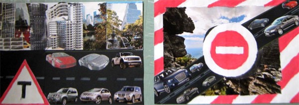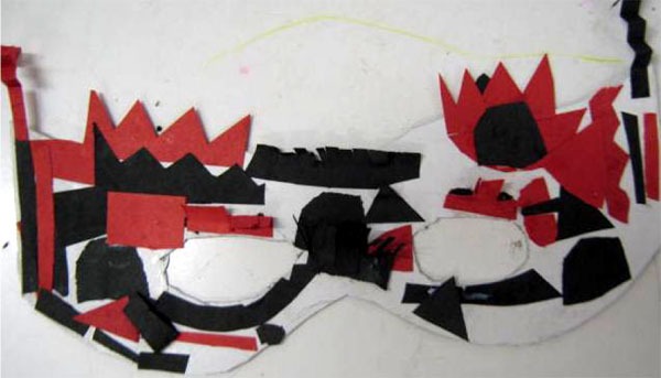 By skool C, soos verduidelik in afdeling 6.1.1, wou die onderwyser haar eie praktyk verbeter en het sy bystand en leiding gevra met idees vir lesse en met die kunskurrikulum. Die eerste les wat die onderwyser aangebied het om, soos afgespreek tussen onderwyser en mentor, as behoeftepeiling te dien, is die maak van ’n plakkaat met tydskrifknipsels van padtekens in rooi, wit en swart verf volgens aanwysings uit ’n beskikbare kuns-en-kultuur-handboekie (foto C1). Hierdie eerste poging het haar tekortkominge met die onderrig van ’n gehalte-kunsles duidelik openbaar.