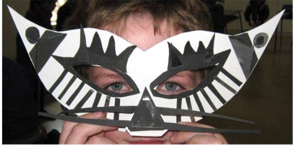Na hierdie voorbeeldles, waartydens die onderwyser getoon het dat sy baie ervare is met die beheer van die groot groepe graad 5-kinders, was daar ’n gesprek oor wat haar behoeftes vir die res van die mentorhulpprogram is. Sy wou die kunstevakke geïntegreerd aanbied en het genoem dat sy die musiekblyspel Cats wil bybring vir die musiekgedeelte. Daar was ’n gesamentlike beplanningsessie vir twee projekte. Die eerste was ’n kleinerige tekening, want die kwartaal was amper op ’n einde en daar was nie tyd vir ’n volle prentmaakprojek nie. Die tweede projek sou fokus op kunshandwerk en die kinders sou elkeen ’n katmasker maak wat hulle gedurende die bewegingsessie op die maat van die musiek uit Cats kon dra. Dit is afgespreek dat die mentor die les aan die een klasgroep sou demonstreer terwyl die onderwyser waarneem en dan sou sy dieselfde les op haar eie aanbied om te sien hoe sy vaar. Daar is na elke les ’n refleksievorm ingevul waarop sy eerlik haar ervaringe neerskryf, sodat dit tydens die gesprek met die mentor aandag kon geniet. Foto C2 toon die lesvoorbeeld wat deur die mentor aangebied is en foto C3 toon die kinders met die maskers wat gemaak is tydens die onderwyser se aanbieding.