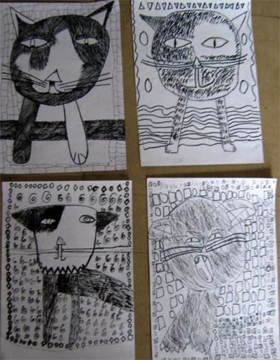 Dieselfde proses is gevolg met die tekeninge van ’n kat, wat aangebied is na ’n visuelegeletterdheidles waarin die mentor aan die onderwyser gedemonstreer het hoe kinders gelei kon word om na Suid-Afrikaanse kuns te kyk. Maggie Loubser se Kat en Kappertjies is aan die kinders gewys en hulle het geleer om die kunselemente in ’n werk van ’n gerekende kunstenaar te identifiseer en te benoem.