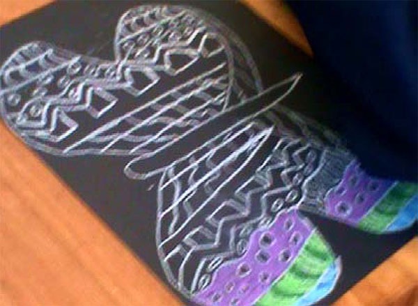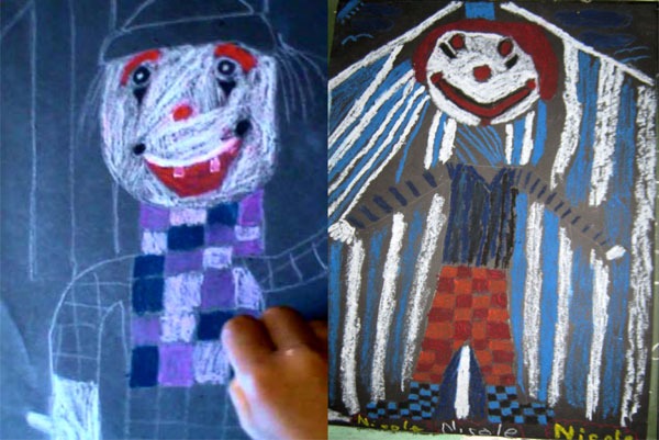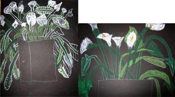 Die tekenwerk het stadig gevorder, maar daar was egte konsentrasie en die resultate van hierdie kinders se tekenwerk – werklik behoeftige kinders, in sukkelende omstandighede – is een van die hoogtepunte van die projek. Dit het weer eens getoon dat alle kinders kan teken as hulle die geleentheid kry en geleer word om waar te neem en sorgvuldig te werk. Foto W4 en foto W5 toon die tekenstadium van die les van twee van die graad 5-kinders. Nadat die plasing op swart papier met wit vetkryt beplan is, het hulle met verskillende skakerings van groen pastel op die blare en stele gewerk. Wit en geel pastel is op die blomme gebruik. Dit was nodig om baie stadig en stapsgewys met die kinders te werk en hulle moes leer om liggies in te kleur en om nie te hard te druk op die pastelle nie. “Skakerings” is ’n splinternuwe woord wat hulle geleer het.