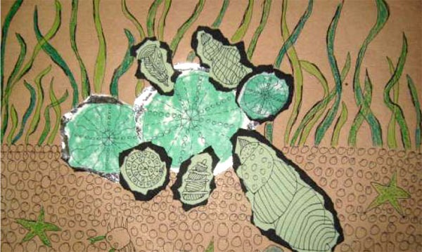 Vir die les oor skulpe en voorwerpe uit die see beplan die onderwyser gemengde media; die kinders kyk na die werklike skulpe en ander goed uit die see en teken daarvan sodat hulle waarnemingsvermoë verskerp word. Hulle gebruik verskillende media in stappe en stel ’n interessante komposisie saam, met die beperkte gebruik van kleur.