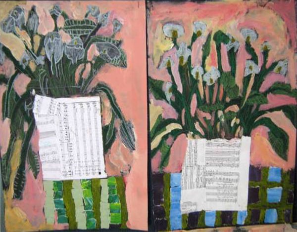 Na die tekengedeelte skilder die kinders vir die eerste keer in hulle lewe met poeierverf. Die vermenging van wit, met klein bietjies rooi en geel daarin om ligte skakerings te verkry, het baie tyd geverg, maar die onderwyser druk deur en die mentor help van tyd tot tyd met die verduideliking totdat die kinders snap wat om te doen. Die finale stappe was met collage, deur gebruik te maak van ou musiekpapier op die blompot, en skakerings van groen en blou tydskrifpapier op die tafeldoekie onder die blompot. Hierdie les het ’n hele paar weke in beslag geneem, maar die eindresultaat is met groot waardering van die onderwyser en skoolhoof in die voorportaal van die skool uitgestal sodat almal kon sien hoe die kinders gevorder het.