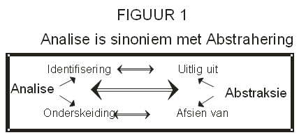 In ons konkrete alledaagse ervaring word die denke van die mens deurgaans gekonfronteer met uiteenlopende tipes dinge. Sodra dieselfde tipe dinge geëien word (geïdentifiseer word), is ons denke daartoe in staat om dit in gemeenskaplike kategorieë te plaas – indelinge soos voëltjies, katte, honde, perde, mense, bome, kerke, skole, en so meer. Hoe anders sal die mens hiérdie perd kan identifiseer as ’n perd (dit wil sê behorende tot die kategorie “perde”), of hiérdie motor kan eien as ’n “motor”? Of selfs perde en motors onderling onderskei? Sonder ’n algemene begrip van perde en motors sou dít onmoontlik wees. In dergelike algemene begrippe word afgesien van die besonderhede van bepaalde perde en motors en word slegs gelet op dit wat gemeenskaplik tussen hulle is. Deur enersyds af te sien van, en andersyds uit te lig, is ons eintlik met niks anders as identifisering en onderskeiding besig nie. Omdat abstrahering egter eintlik berus op kategorisering (uitlig uit, en afsien van) beteken dit dat analise en abstrahering in ’n bepaalde opsig sinoniem is (Figuur 1).