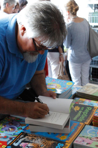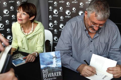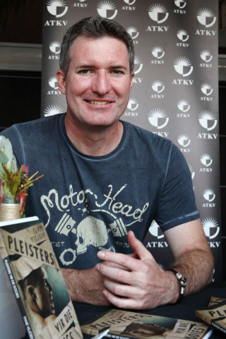 FJ Labuschagne teken ’n kopie van sy roman Beseringstyd.