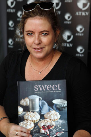 Samantha Linsell met ’n kopie van haar boek Sweet, a demonstration of decadence.