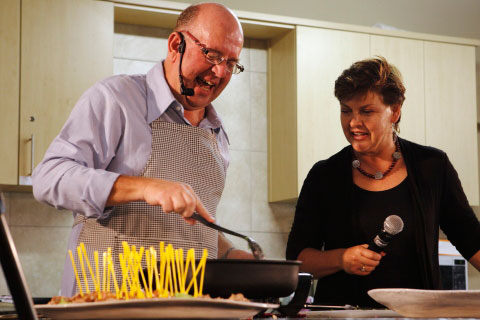 Baassjef François Ferreira, die skrywer van Koskaskos, en Riana Scheepers, die skrywer van Vallei van melk en Heuning, het ’n prettige kosdemonstrasie in Die Kaya gedoen. Die saal was stampvol.