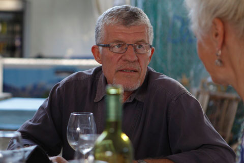 Gerrit Rautenbach, die samesteller van Mooiloop, mooiste reisstories, gesels met vriende.