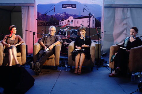 Marida Fitzpatrick praat met Bernette Bergentuin (Stilleto's van staal), Sophia Kapp (Driehoek) en Kristel Loots (Katerina se mojo) oor die grensverskuiwende aard van die moderne liefdesverhaal.