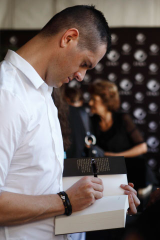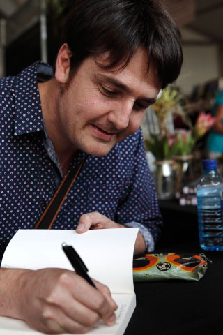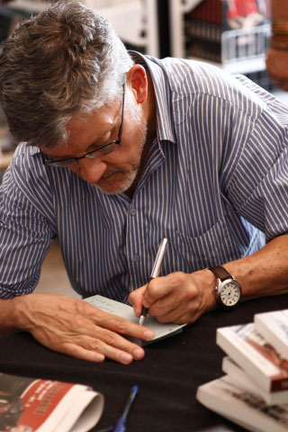 Dennis Cruywagen teken ’n kopie van sy boek Brothers in War & Peace.