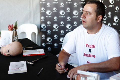 Thomas Mollett teken ’n kopie van Bloody lies.