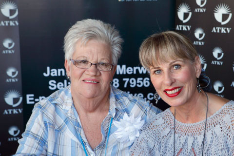 Marita van der Vyver en Magriet Rossouw. Magriet het ’n kopie van Die coolste ouma op aarde in ’n Facebook-kompetisie gewen, en daarmee saam ook ’n heerlike koppie tee en koek saam met Marita.