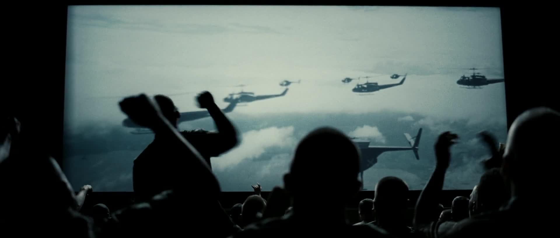 Dit kan wees dat Baudrillard die film oordink. Michael Haneke, daarenteen, fokus op die spesifieke en bekende “Ride of the Valkyries”-toneel, waar die Amerikaners die plaaslike Viëtnamese aanval en Wagner oor die luidsprekers bulder. Haneke (2010:576) voel dat hierdie toneel, met die lansering van missiele en die rat-tat-tat van die koeëlreën op die Viëtnamese wat in die lug geslinger en in stukke geskiet word, 'n voorbeeld is van hoe ons as toeskouers aandadig raak aan die geweld wat uitgebeeld word. Ons word nie net as medepassasiers in die helikopter geposisioneer nie, maar word ook in staat gestel om die skouspel sonder enige aanspreeklikheid waar te neem. Laasgenoemde word geïllustreer in Sam Mendes se Jarhead (2005), waar 'n groep soldate kyk na die nuus wat Irak se inval van Koeweit in 1990 aankondig. Nadat die ambassadeur van Koeweit die VSA om hulp vra, kondig korporaal Alan Troy (Peter Sarsgaard) aan dat die jong soldate uiteindelik oorlog toe kan gaan. In die volgende toneel kyk die troepe Apocalypse now. Hulle raak luidrugtig van opgewondenheid, verorber hul springmielies en boots die bewegings van die soldate op die skerm na soos die helikopters die Viëtnamese dorpie nader. Die spanning bou op totdat die jong soldaat Anthony Swofford (Jake Gyllenhaal) homself in die skouspel verloor en meegevoer uitroep: “Shoot them motherf*ckers!”