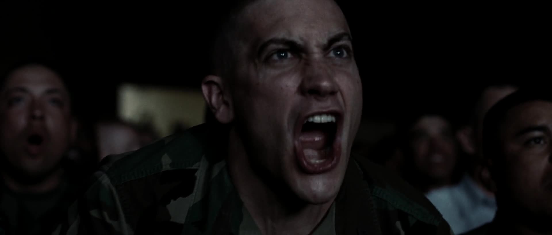 Figuur 5. Die troepe kyk Apocalypse now (bo) en Anthony Swofford (Jake Gyllenhaal) verloor homself in die skouspel (onder).