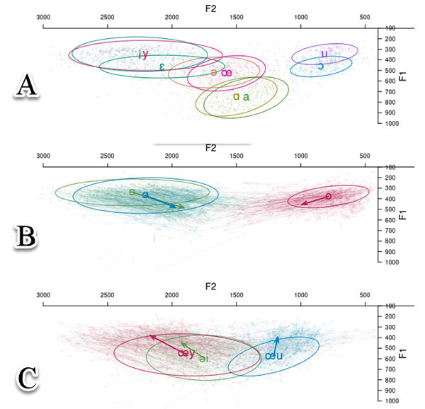 Figuur 2. Vokaalruimtes van drie tipes vokale van alle sprekers en alle gebiede: A = simplekse monoftonge; B = verglydende vokale; C = egte diftonge. Ellipse omsluit vokale met vertrouensinterval van 1.0.
