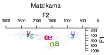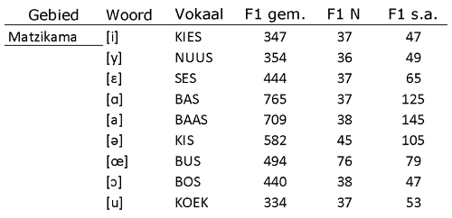 Saam gelees, verskaf Tabel 1 en Figuur 2 basiese akoestiese inligting aangaande die vokaalsisteme van Bruinafrikaans (Bruinafrikaans) as geheel. Volledige tabelle word in die Bylaag verskaf; ook ’n oorsigsfiguur. Ter illustrasie gee ons hier net die toepaslike tabel en figuur van F1 van die monoftonge van Matzikama.