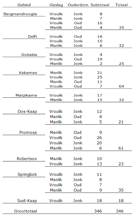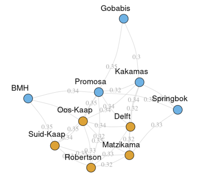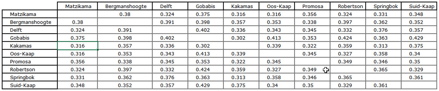 Die afleiding wat op grond van hierdie resultate gemaak moet word, is dus dat ’n totale homogeniteit van al tien gebiede nie ondersteun word nie. Hier is aangetoon dat daar twee subgroepe onderskei kan word, naamlik Suid-Kaap, Delft, Robertson, Matzikama en die Oos-Kaap enersyds, en Bergmanshoogte Springbok, Promosa, Gobabis en Kakamas andersyds. Inmiddels lyk dit asof Gobabis sy aparte status kwytgeraak het, want nou sit dit duidelik in die noordelike (blou) kluster soos in hierdie figuur gesien kan word.