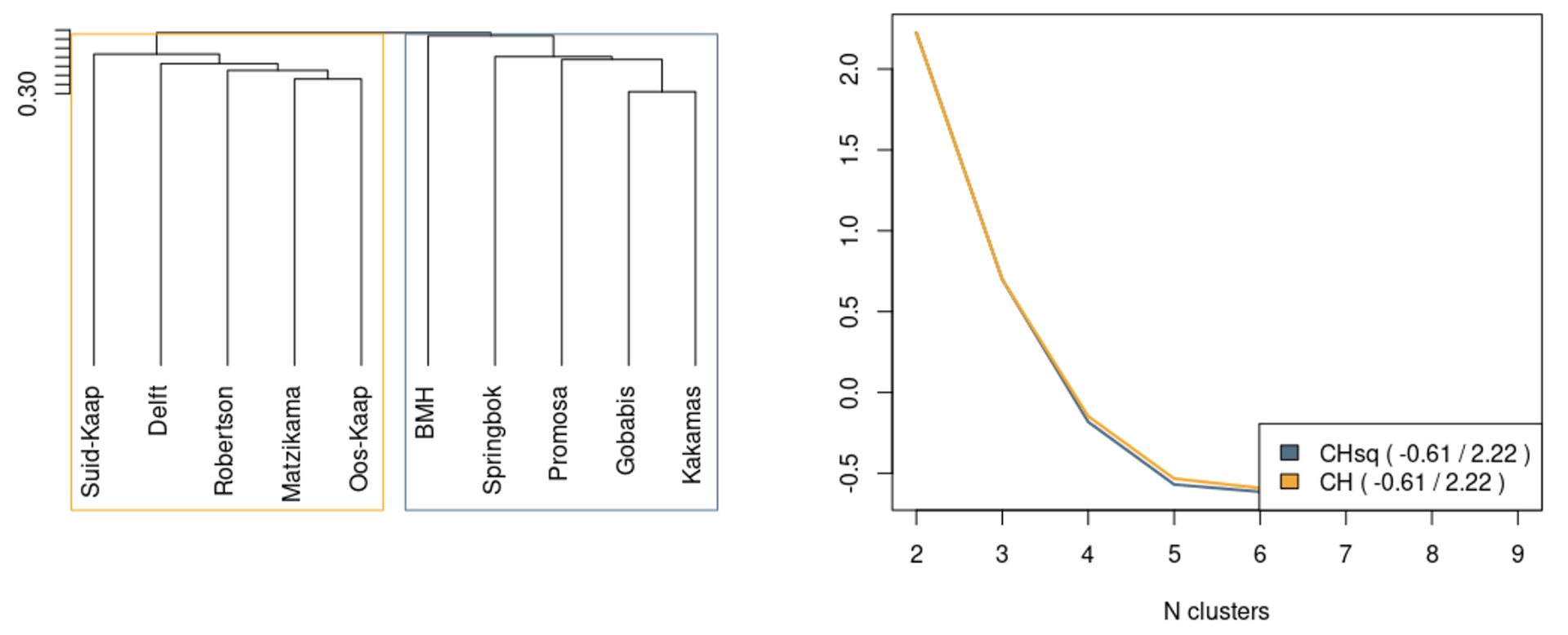 Figuur 6. Links: Dendrogram gebaseer op die hiërargiese agglomeratiewe klustering van alle vokaalruimtes (opnamegebiede). Reghoeke dui op twee aparte klusters (oranje, blou). Regs: Kwaliteitsmetings (CH, CHsq) met ’n verskillende aantal klusters (N op x-as). Hoë tellings vir CH/CHsq (y-as, z-genormaliseer) dui aan dat die ooreenstemmende aantal klusters optimaal is in die dendrogram (d.w.s., 2 vir CH, soos getoon word in die dendrogram links).