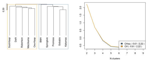 Hierdie dendrogram toon ’n klustering (’n stel reghoeke) van al die opnamegebiede. Die kwaliteit van ’n klustering kan gemeet word met behulp van verskeie soorte statistiek, waardeur die optimale aantal klusters in ’n dendrogram geïdentifiseer kan word. Ons maak gebruik van die Calinski-Harabasz-indeks (CH-indeks), wat die ratio van inter- en intraklustervariasie bepaal (baie soos ’n F-meting in ANOVAs); ’n hoë CH-indeks beteken hoë homogeniteit tussen klusters (Studer 2013). Hoë tellings verteenwoordig dus goeie klusterings.