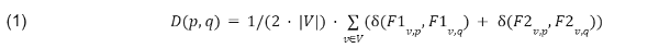 V verteenwoordig die stel vokale, en ð (x,y) die oorvleuelingsafstand (of -ongelyksoortigheid) tussen die verspreiding van twee rye x en y soos gedefinieer in Pastore en Calcagni (2019:2, eqn (2)).