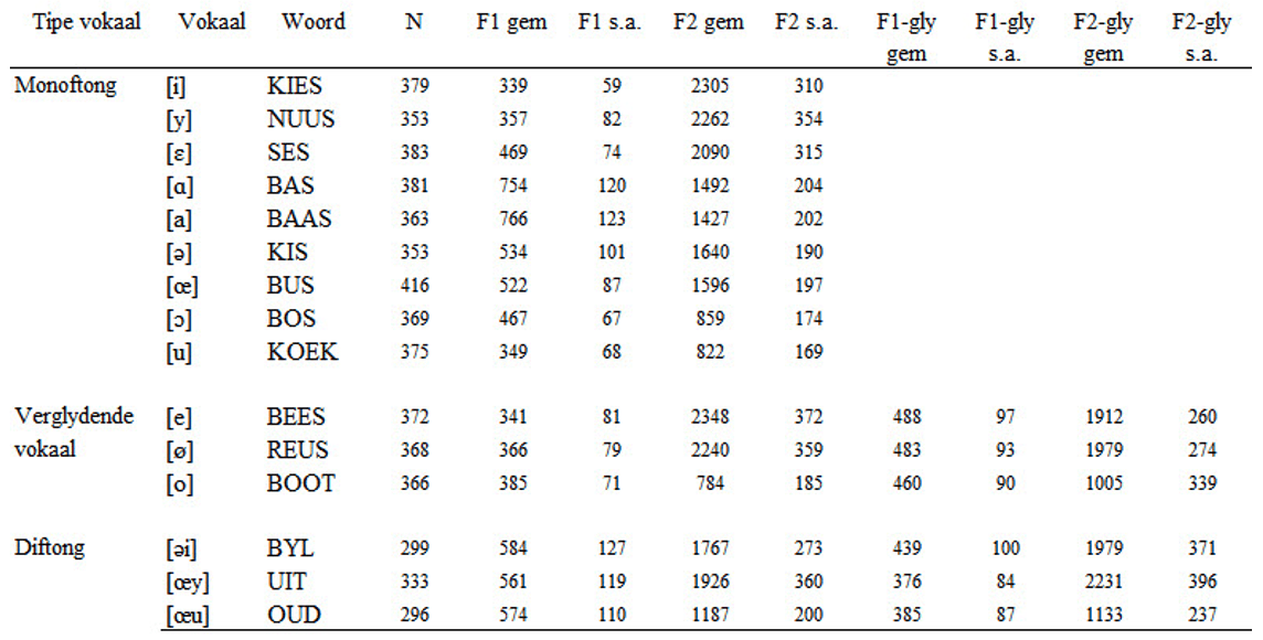 The Afrikaans vowels involved in the present study are /i/, /y/, /e/, /ø/, /ɛ/, /ɑ/, /a/, /ə/, /œ/, /ɔ/, /o/ and /u/ (in kies, nuus, bees, reus, ses, bas, baas, kis, bus, bos, boot and koek respectively; the three basic diphthongs, /əi/, /œy/ and /œu/ are those in byl, uit, and oud respectively. An acoustic description of these segments was elicited to be used in the present study.