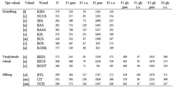 Tabel 2. Formantfrekwensie-inligting van alle sprekers van alle gebiede saam geneem
