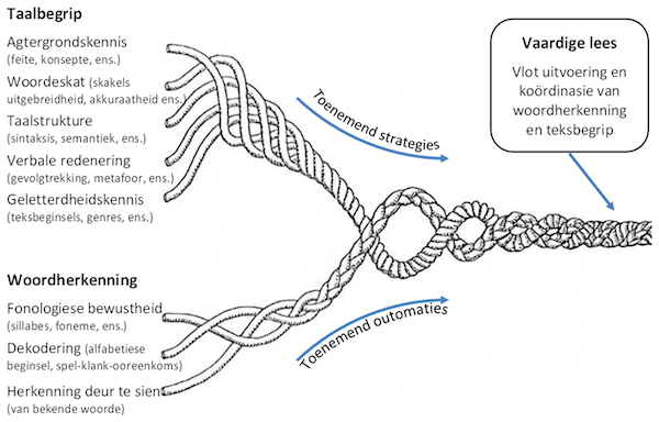 Aanvanklik ontwikkel hierdie afdelings of vaardighede afsonderlik, maar soos leesvaardigheid toeneem, word hulle al hoe meer geïntegreer tot ’n stewige, samehangende tou – ’n metafoor vir vloeiende lees met begrip, wat die uiteindelike doel van leesonderrig is (Seidenberg 2017:3 en Scarborough 2023). Hierdie model word tans wyd gebruik in die intervensies vir beter leesonderrig in Suid-Afrika, veral in die Grondslagfase, soos die Terug op Koers-program (TOK) in die Wes-Kaap. Dit is ’n inisiatief van die Wes-Kaapse Onderwysdepartement en is in 2023 van stapel gestuur om die leeragterstande wat deur COVID 19 veroorsaak is, die hoof te bied. Dit fokus primêr op die verbetering van leerverliese in tale en wiskunde.