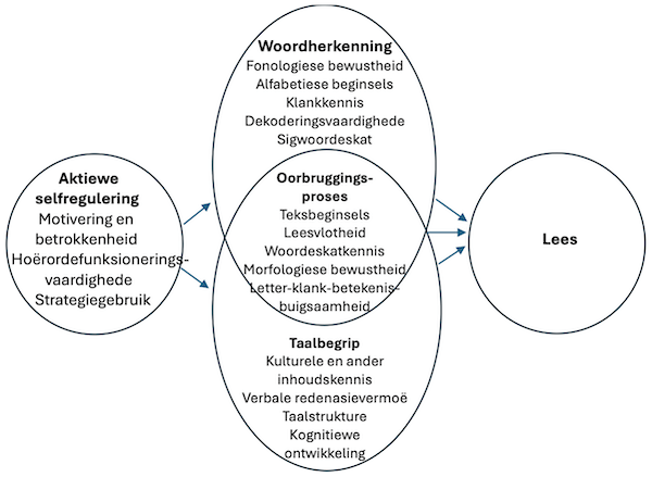 Die leesproses wat begrip moontlik maak, vereis verskeie geïntegreerde vaardighede. Volgens die bostaande model begin die leesproses by die fonologiese en fonemiese bewustheid van leerders vanuit hulle kennis van die gesproke taal (luister en praat). Daarna volg die dekoderingsproses waarin kennis van die klank-letter-verhouding spesifiek onderrig en ingeoefen word. Dit behoort te lei tot die outomatiese herkenning van letters en woorde. Vervolgens kan leerders vorder tot die vloeiende lees, gekoppel aan en geïntegreer met die betekenis binne sinne (Perfetti en Stafura 2014:29).