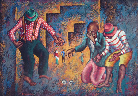 | Diederick During (1917–1991), Dice Players / Dobbelaars, geen datum, gemengde media op kartonbord. |