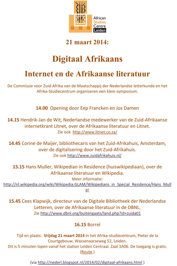 Dat zijn de bevindingen bij het Symposium Digitaal Afrikaans: Internet en de Afrikaanse literatuur. Op vrijdag 21 maart hielden de Commissie voor Zuid-Afrika van de Maatschappij der Nederlandse letterkunde en het Afrika-Studiecentrum een klein symposium over de digitalisering van de Afrikaanse letterkunde.