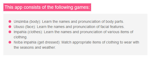 Die speltoepassing is op dié stadium die enigste een vir ouer kinders, tot graad 10 – ons het dit ontwikkel in samewerking met die Universiteit Stellenbosch om die regte woorde per graad te beklemtoon, dis ’n aanloklike woordsoekspeletjie.