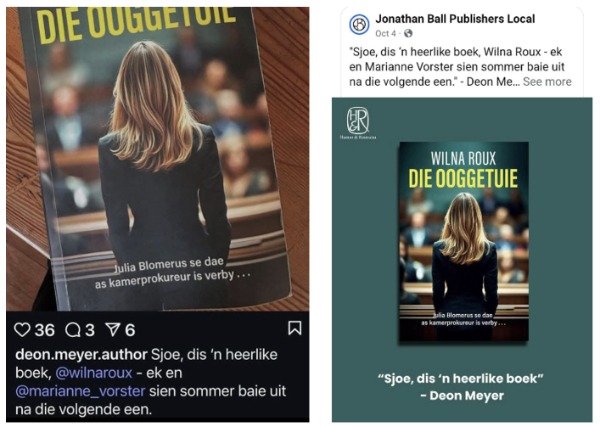 Deon Meyer vertel ons hy lees Wilna Roux. Een sinnetjie op Instagram. Dit word raakgesien deur haar uitgewer, uitgebasuin op hulle blaaie, en sy haal Nielsen se trefferlys.