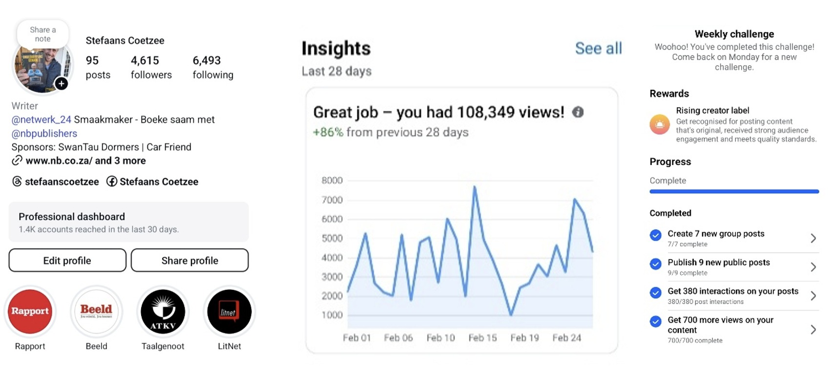 Ek het al dieselfde soort getalle met video’s op Instagram gehaal; op Facebook het my kyke verdriedubbel. (Veral nadat ek aan “Alt-teks” aandag begin gee het.)