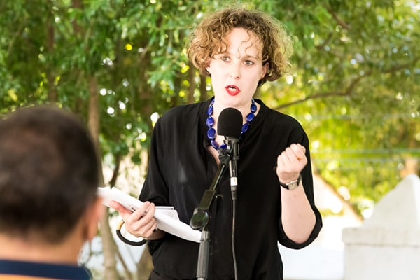 Meg Vandermerwe, skrywer van Zebra crossing, aan die woord by die Adam Small-fees. (Foto: Suki Lock)