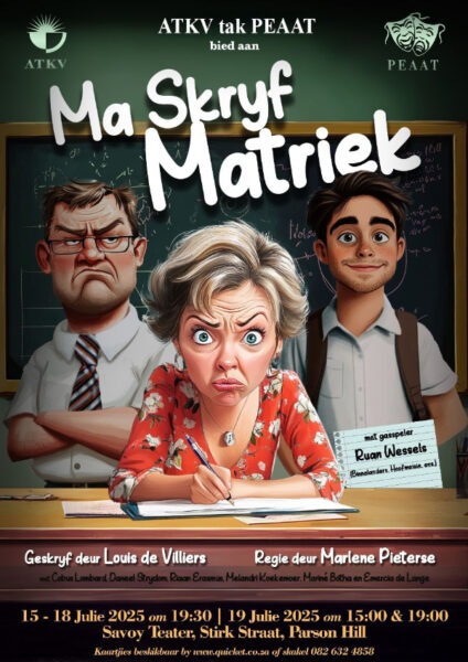 Ma skryf matriek, wat Dinsdagaand in Gqeberha se Savoy-teater geopen het, was twee uur van onverdrote pret. Selfs my liewe Engelssprekende vriendin, Melissa, het haar gate uit geniet, al het sy die advertensie verkeerd verstaan. Melissa werk by ’n baie bekende skool en het gedink die storie sal handel oor “a typical helicopter mom, one of those we deal with every day”.