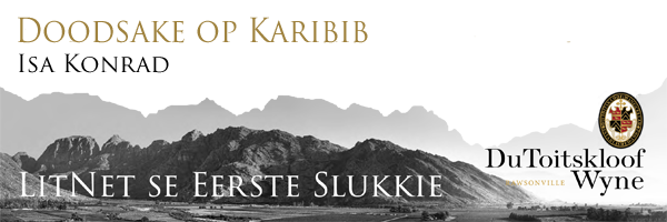 ’n Stoel skuif en hy hoor die geklik van haar hakskoene oor die vloer. Sy binnegoed trek styf. Skielik is sy daar. Hier. Staan sy voor hom in haar deftige rooi bloes en swart langbroek, blonde hare gekap, gesig ingekleur. Sy het ’n skinkbord met koppies en pierings in haar hande. Lyk nietemin pure stad, pure klas. Net die opgehewe klein litteken bokant haar regteroog verklap nog wat haar in die eerste plek Karibib toe gebring het. Twee weke gelede het sy ’n getuie in die moord op Faan Visser geword omdat sy by die mediese sentrum gaan hulp soek het. Con het haar met sewe steke in haar voorkop en ’n blou oog leer ken. Danksy haar man. Oftewel Die Poephol, soos hy verkies om aan Eugene Gouws te dink.