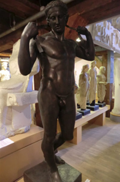 Figuur 3. Kopie van ’n naakte manlike beeld in die klassieke styl van Polikleitos. Dit dui aan die estetiese spanning tussen simmetrie, balans en harmonie. Liggaamlikheid is in hierdie sin die naakte waarheid wat die adel van die menslike siel verteenwoordig en ook simboliseer. Die skoonheid en harmonie van liggaamlikheid ver-beeld en vergestalt die adel, heerlikheid (doksa) van die menslike siel en het vanuit hierdie perspektief niks met pornografie te doen nie. Foto: D.J. Louw. Met toestemming van: Royal Plaster Museum, Kopenhagen.